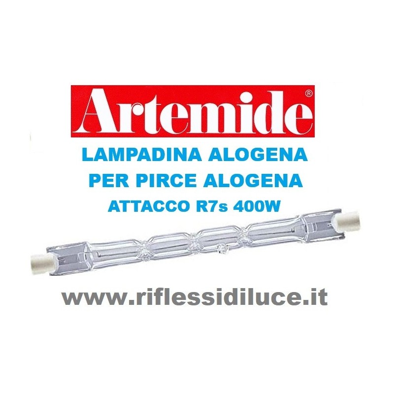 Lampadina alogena per Pirce alogena sia a sospensione che a soffitto, attacco R7s potenza 400W lunghezza 118 mm, alimentazione 230Vac. Lampadina di ricambio per la Pirce versione alogena di Artemide.