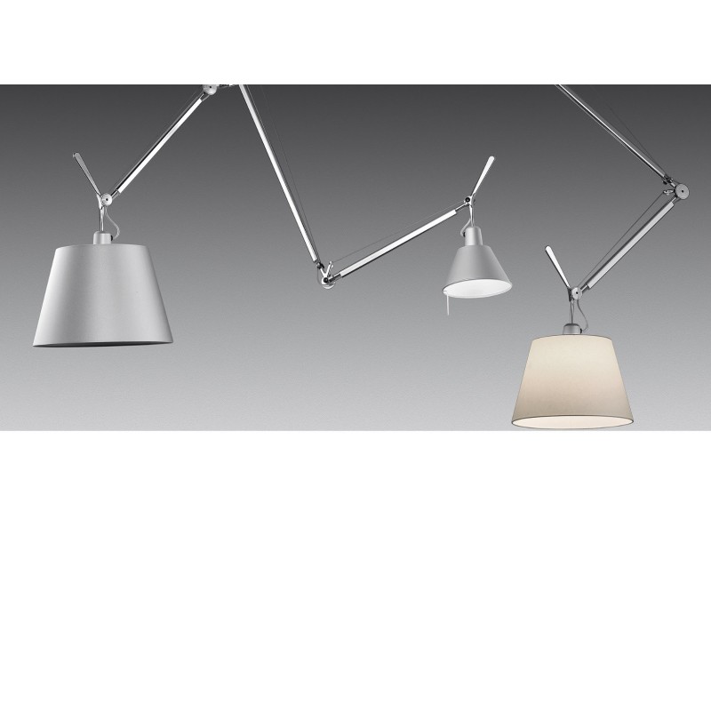 Artemide Tolomeo sospensione decentrata con diffusore in raso di colore grigio del diametro di 36 cm. Struttura a bracci mobili in alluminio lucidato, snodi in alluminio brillantato. Lampada con attacco E27, ecoalogena potenza massima 150W, oppure risparmio energetico o led.