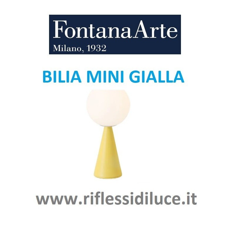 Fontana Arte lampada da tavolo Bilia mini, base in metallo di vari colori, diffusore in vetro soffiato bianco satinato. Cavo di alimentazione, interruttore e spina colore trasparente. Può montare una lampadina con attacco G9, LED potenza 6W NON DIMMERABILE. Idea nata nel 1932 dalla mente eccelsa di Gio Ponti. Da una delle tante magie di Gio Ponti, nasce Bilia, una sfera in un magico equilibrio, due forme geometricamente perfette. Oggetto che si illumina, adatto a tutti gli ambienti e capace di illuminare in modo aggraziato e confortevole. La fonte luminosa contenuta all'interno di una sfera perfetta di vetro maestralmente soffiato, di colore bianco satinato, produce un effetto luce mai abbagliante ed altamente confortevole. Bili a la troviamo di due dimensioni, Bilia con una altezza di 43 cm e un diffusore del diametro di 20 cm, Bilia mini con altezza 26 cm e un diffusore del diametro di 12 cm. La base in metallo la troviamo di diverse colorazioni, ottone spazzolato, nichel spazzolato, bianco, rosso, nero lucido, nero opaco, rame lucido, giallo e verde.