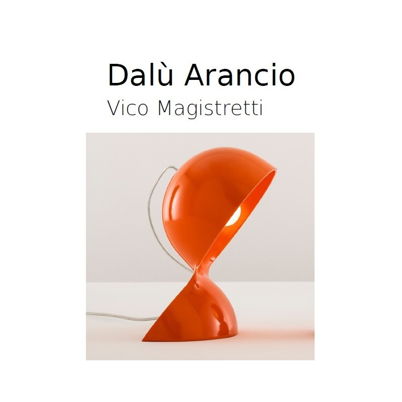Artemide lumetto da tavolo Dalù. Struttura in materiale termoplastico, i colori posso essere, bianco, nero e arancione. Cavo con interruttore e spina trasparenti. Artemide Dalù, nasceva negli anni sessanta disegnato da Vico Magistretti. Dalla forma semplice, arrotondata e sempre attuale. Lumetto da tavolo che ben si integra in tutto gli ambienti. Artemide Dalù, ancora oggi um lumetto da tavolo ricercato ed ancora molto richiesto.