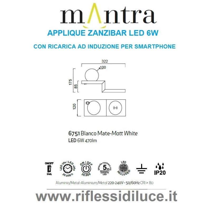 Mantra applique modello Zanzibar, struttura in alluminio di colore bianco e diffusore in vetro di colore bianco latte. Sorgente led potenza 6W, flusso luminoso 470 Lumen, temperatura di colore bianco caldo 3000° Kelvin. Dotato di basetta per ricxarica telefono a mezzo wireless.