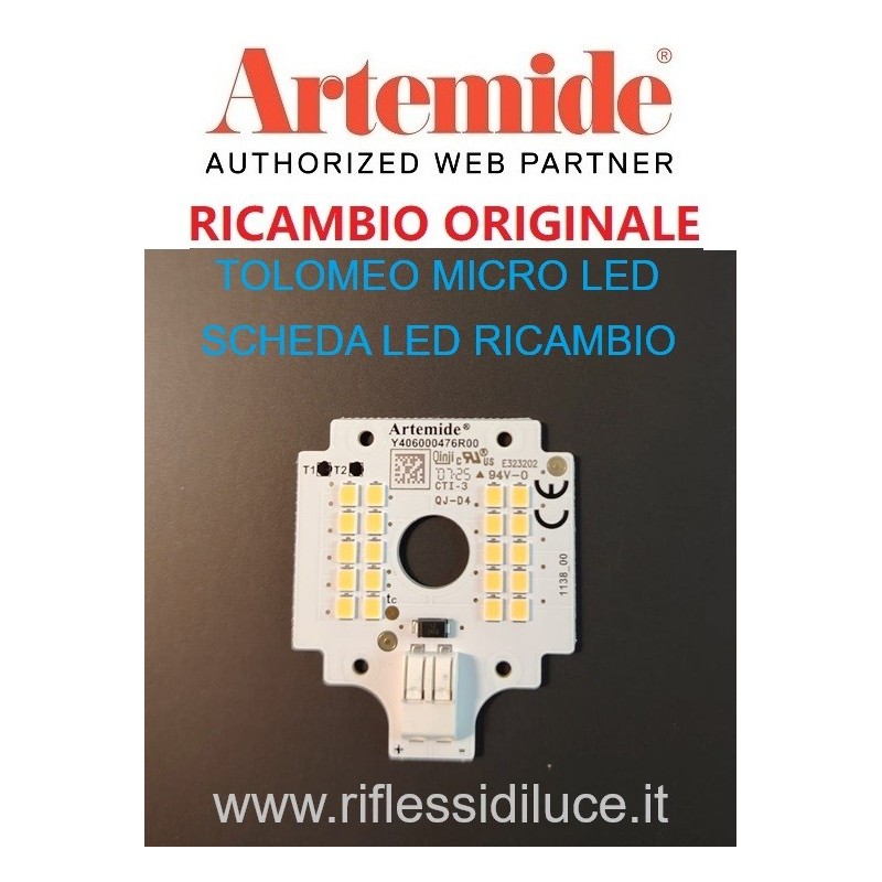 Artemide ricambio originale, scheda led di ricambio per Tolomeo micro led, temperatura di colore 3000 gradi Kelvin. Siamo rivenditori Artemide dal 2000 e dal 2006, siamo Artemide Center. Da noi puoi ordinare anche i ricambi delle migliori marche dell'illuminazione. Ricambi originali per lampade Artemide, de Majo, Cini & Nils, Fontana Arte, Egoluce e tante altre. Per maggiori informazioni ti puoi interfacciare con il nostro ufficio tecnico, dove avrai a disposizione un tecnico che da oltre 10 anni gestisce i ricambi delle nostre migliori marche.